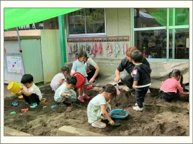 ようやく涼しくなって来た園庭で走り回ったり、すべり台、ブランコ、メリーゴーランド、砂場遊びをしました。
