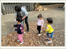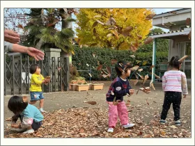 初めて保護者と離れての保育は、泣いてしまう子もいましたが、外でたくさんの落ち葉を集めて上から降らせたり、両手いっぱいに持って舞い上げたりすると、少しずつ参加していて、笑顔も見られました。