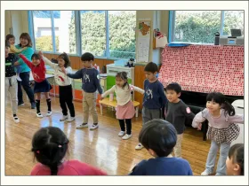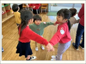 つくし組のお部屋に来てくれた年長のお兄さんお姉さんと体操をしたり、『なべなべ そこぬけ』をしたり、最後は『どうぶつバスケット』をして盛り上がりました。