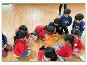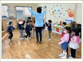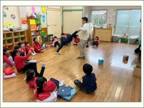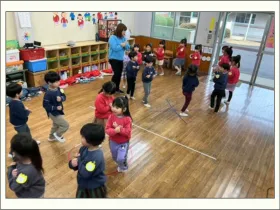 つきぐみは、懐かしのうめぐみへ。うめぐみは、憧れの年長クラスを体験。すみれぐみは、昨年通っていたつくしぐみへ。