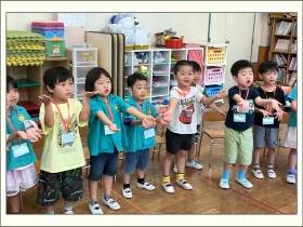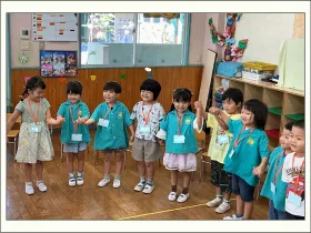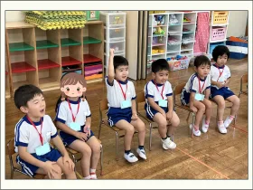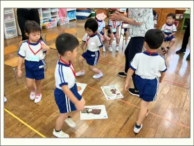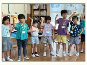 正課・英語(9/17) 2025年9月18日 最終更新日時 : 2025年9月18日 グリーンヒル幼稚園英語のレッスンにも慣れ、先生の問いかけに対して、大きな声で答える子が増えてきました。また、手足を大きく動かしながら、歌を歌ったり、ゲームをして楽しんでいました。今日は、12ヶ月や季節の復習をしながら、「9月」と「秋」をしっかり覚え、うめぐみ、つきぐみは、新たに「とんぼ」「栗」の単語を覚えました。日常生活の中でも少しずつ英語を取り入れられるといいですね。