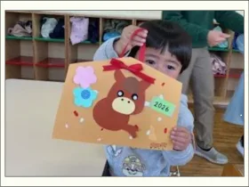 今日のプレ保育は『作品展製作』でした。 少しずつ笑顔で遊べるようになってきた子ども達。前回絵の具で模様を付けた絵馬に馬を貼りました。やる気満々で、たくさんお花を貼ってくれた子もいて、かわいい絵馬ができました。 新聞を丸め […]